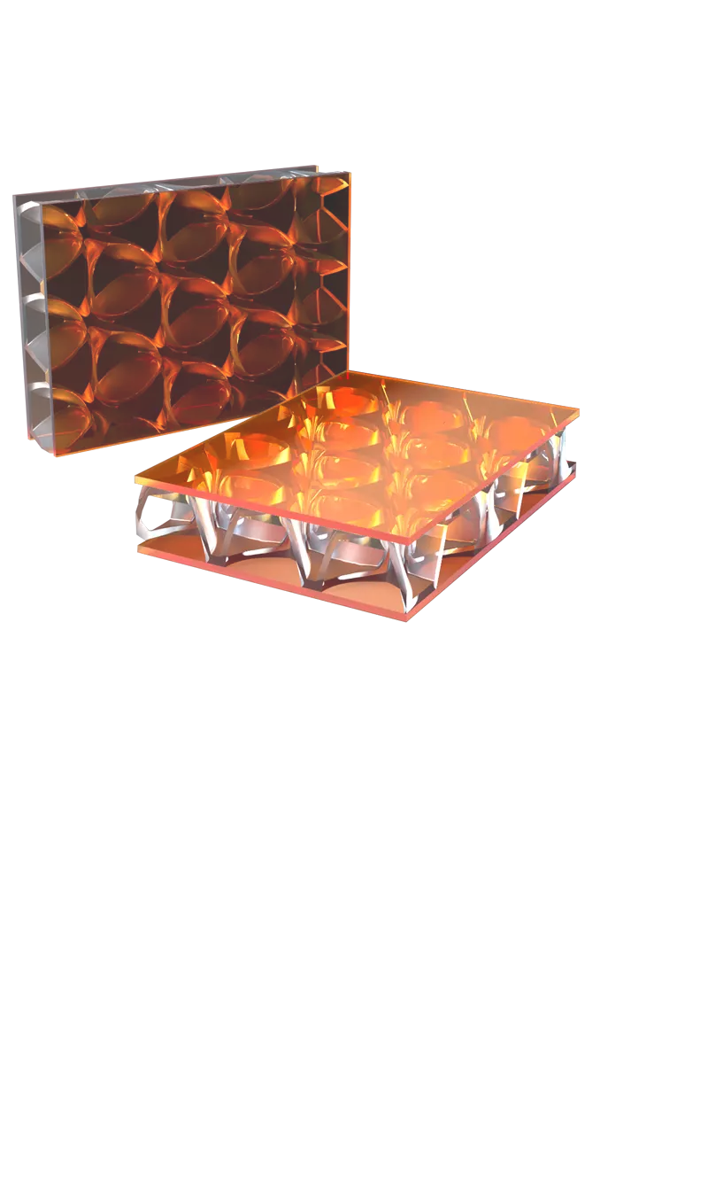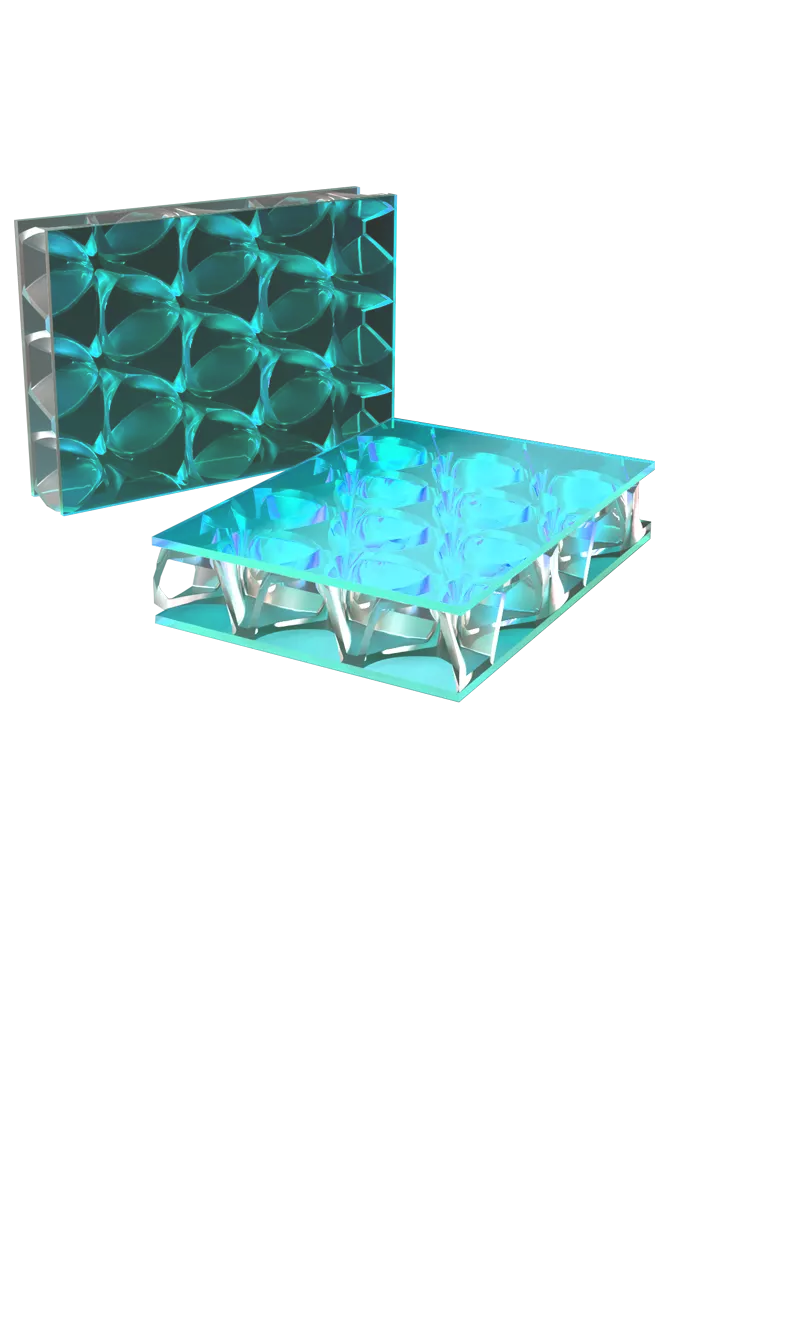 Our exterior panels are extremely lightweight and durable, and thus suitable for most exterior applications. With translucent or transparent colorways and a honeycomb core design that adds extra strength, exterior facades and canopies have a high level of impact resistance, flexural strength, and thus longer spans between supports.