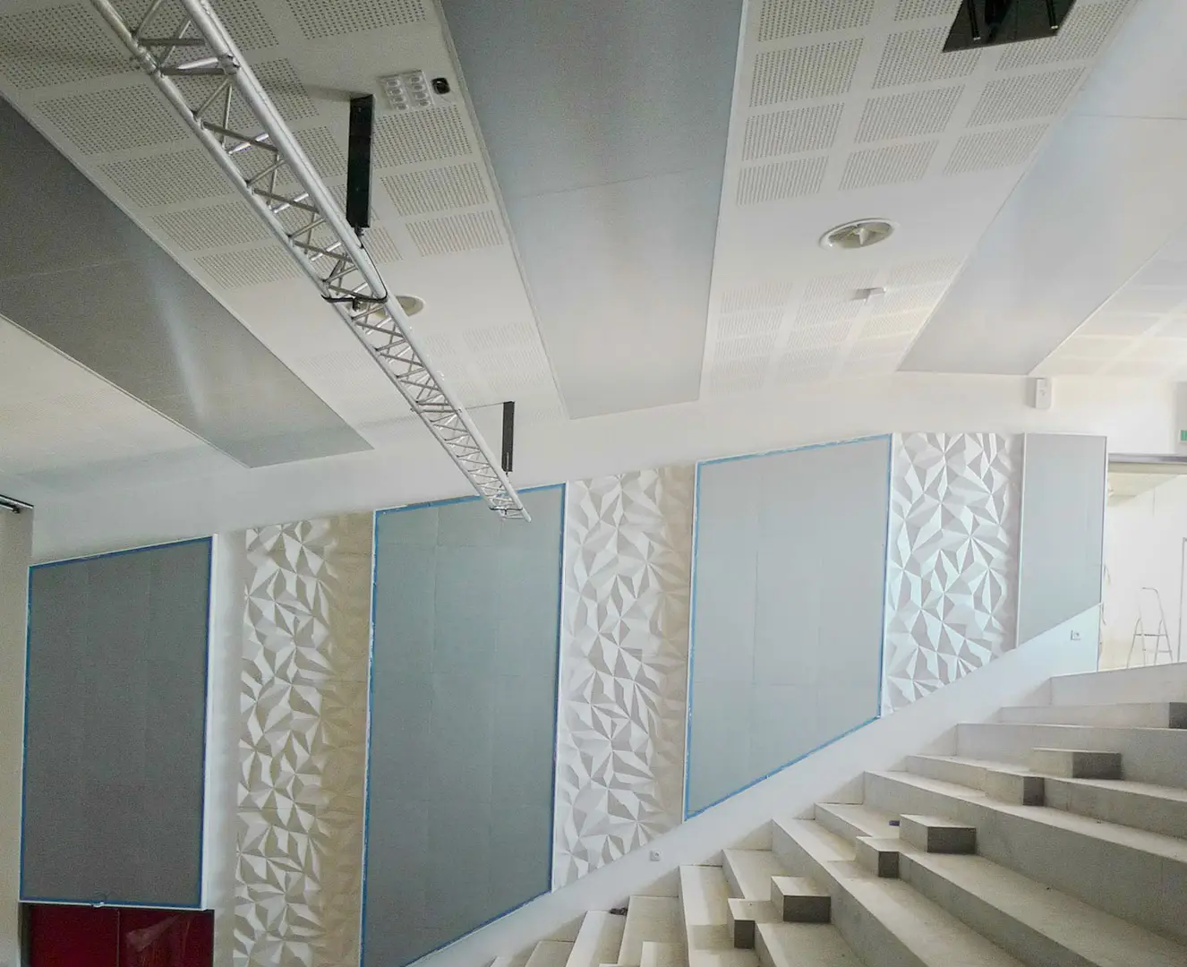 In a college amphitheater, AIR-board acoustic backlit baffles stand out for their exceptional sound absorption, crucial for enhancing speech intelligibility and overall acoustic quality in such a large, open space. The backlit feature adds a dramatic, visual element, contributing to an engaging atmosphere for performances and lectures. These baffles effectively minimize echo and background noise, ensuring clear communication and improving the auditory experience for audiences. Their incorporation marries functionality with aesthetic appeal, creating an optimal environment for educational and cultural events.